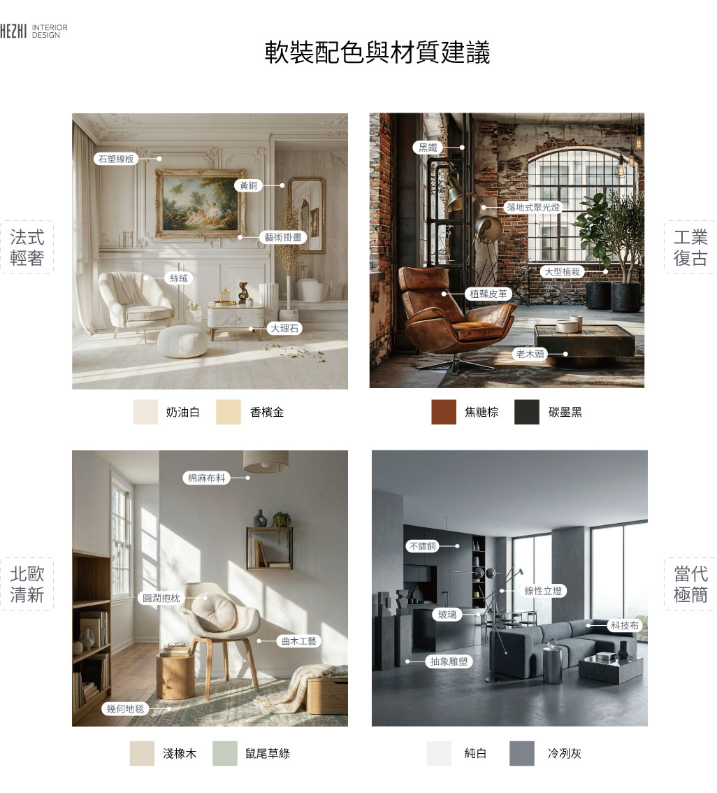 風格類型 | 建議主色調 | 核心家具建材 | 必備裝飾元素 |