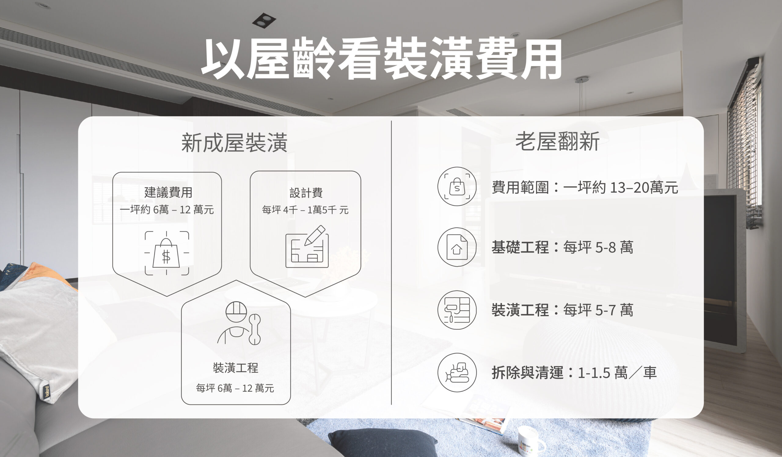 老屋翻新常涉及 水電更新、防水處理、格局調整,基礎工程費用比新成屋高。