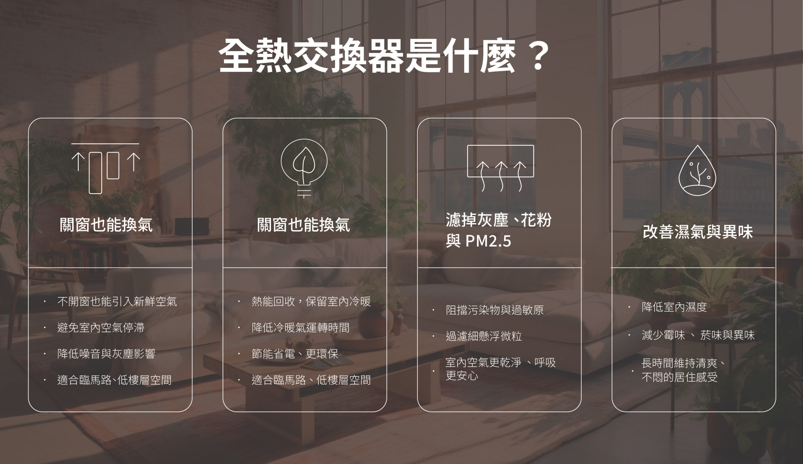 簡單來說,全熱交換器是一種幫你「換氣」又「省能源」的設備。